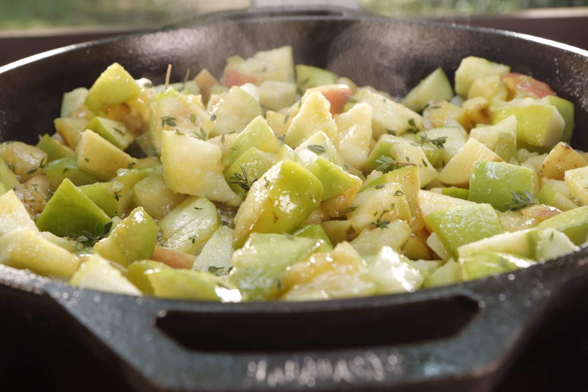 Apples are in season, so why not try them for breakfast with a tasty apple hash? You could even prepare it over a campfire for a hot, fresh meal on a fall family camping trip! We prepared it using a cast-iron skillet for the fullest flavor possible, but any medium-depth skillet will do.