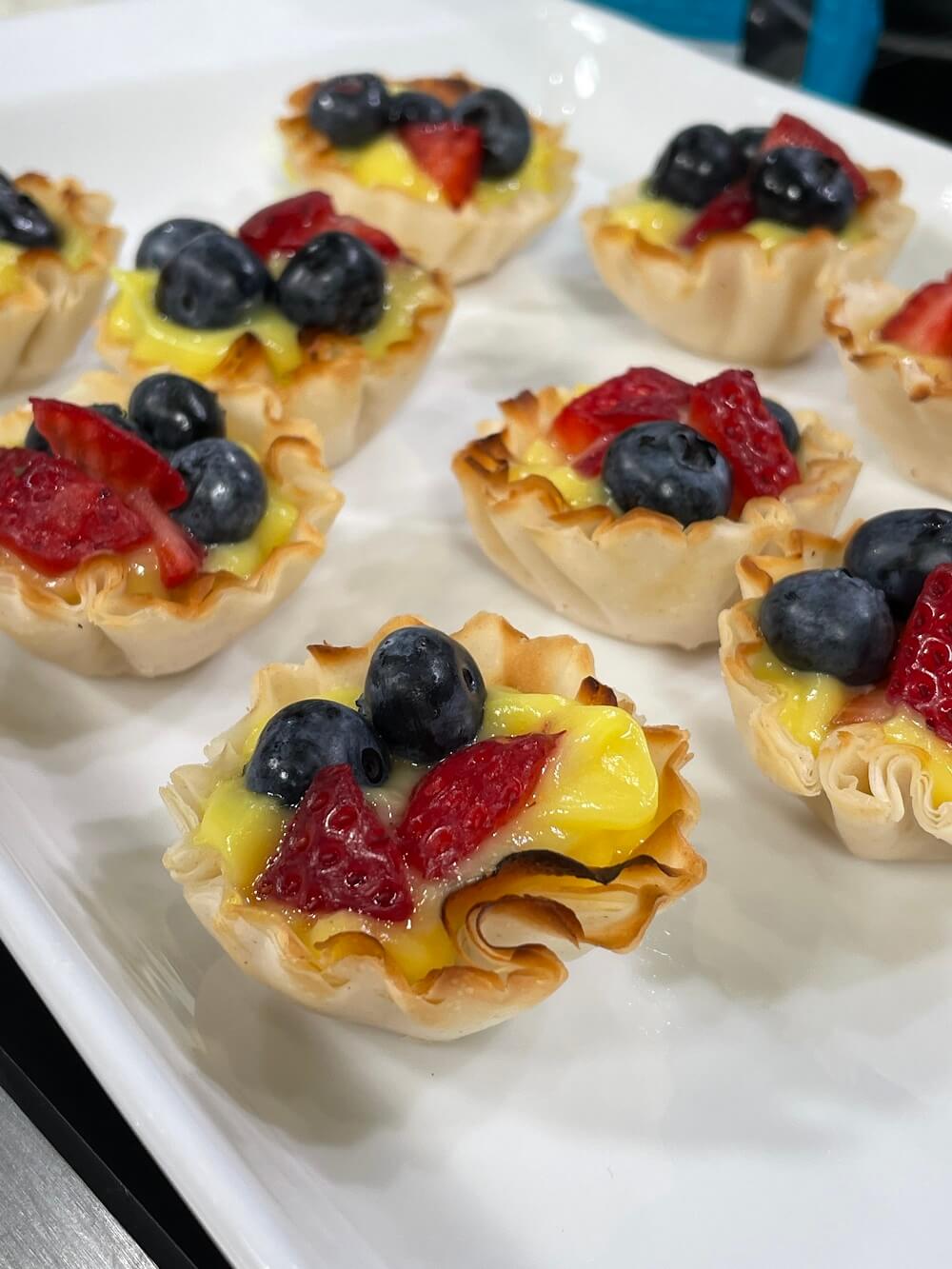 - Pipe into phyllo cups and top with mixed berries. Serve immediately once assembled.