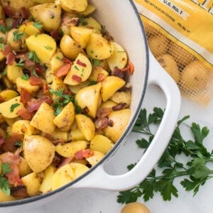 Can I make this salad ahead of time? It’s best when served warm, but you can prepare the components ahead of time. Cook the potatoes and the bacon-onion dressing separately. When you’re ready to serve, gently reheat both and combine them.