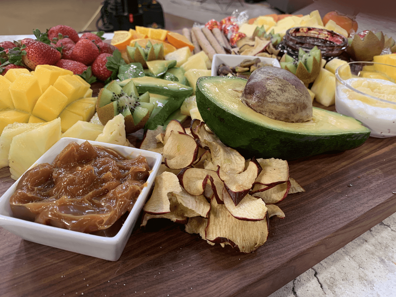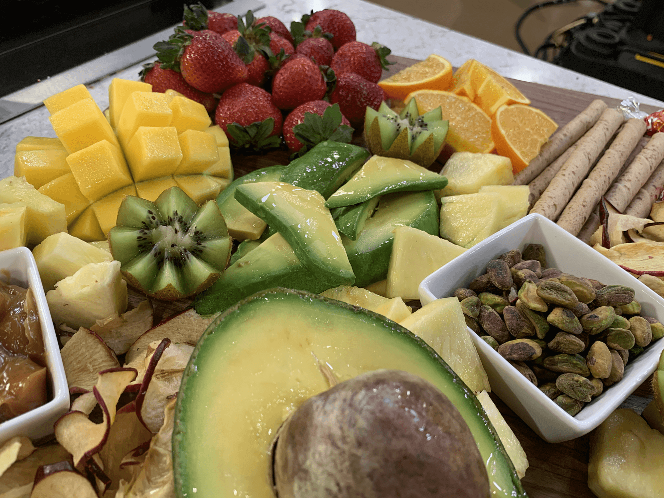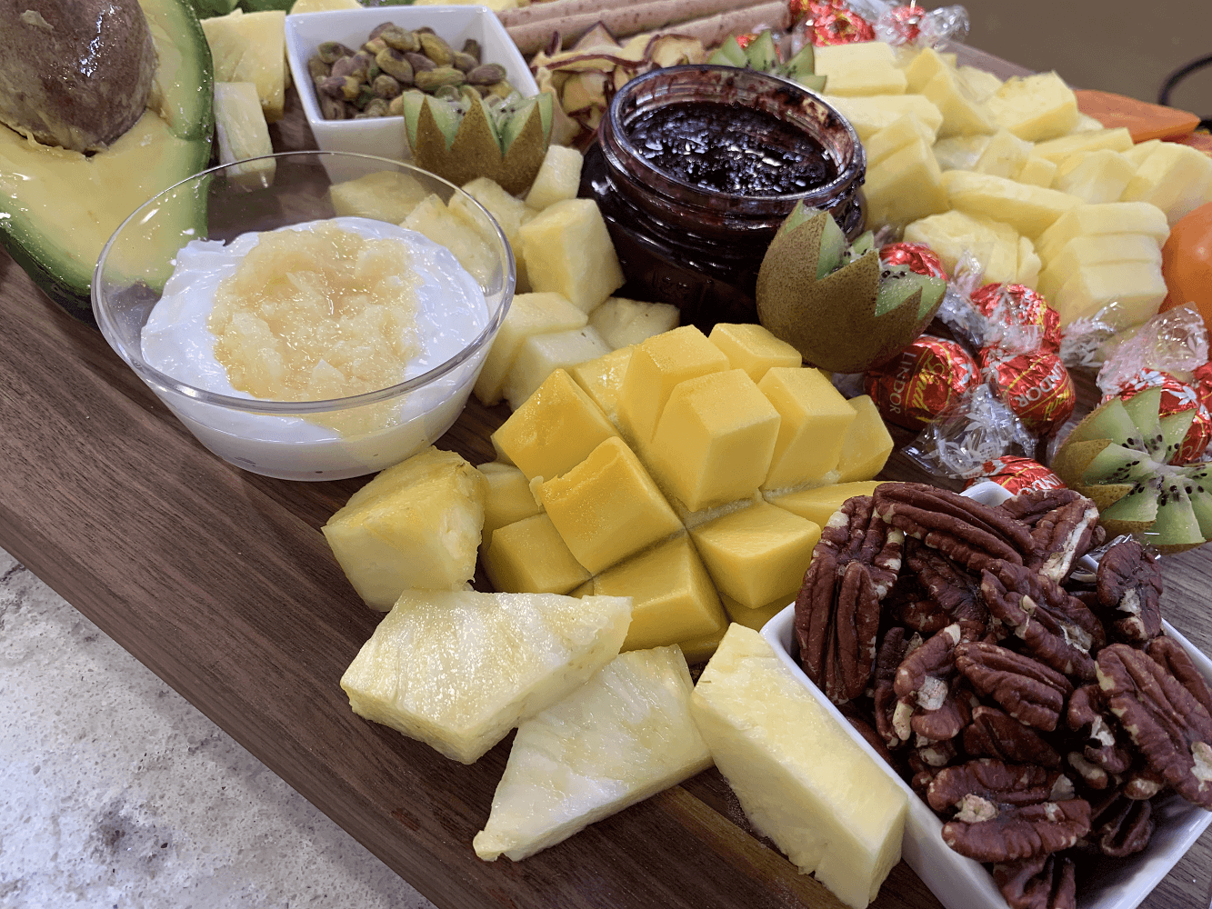 Our board uses tropical avocado slices, orange slices, strawberries, pineapple chunks, nuts, and several different fruity dips. We ordered these delectable fruits from our partners at Tropical Fruit Box, which makes it easy for you to find both exotic and familiar fruits from all over the world. Best of all, theyโre delivered right to your doorstep!