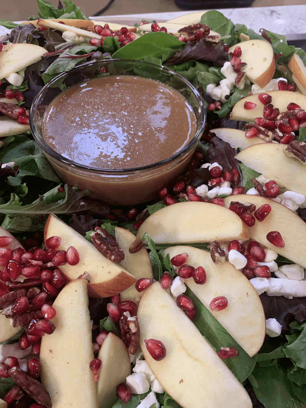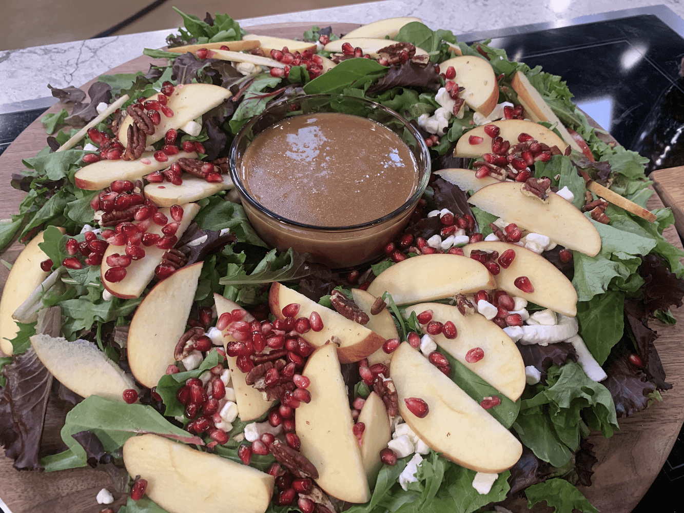 - On a large board or platter, arrange salad leaves in a round wreath shape. Dot over apple slices and goat cheese. Scatter over the pomegranate seeds and pecans