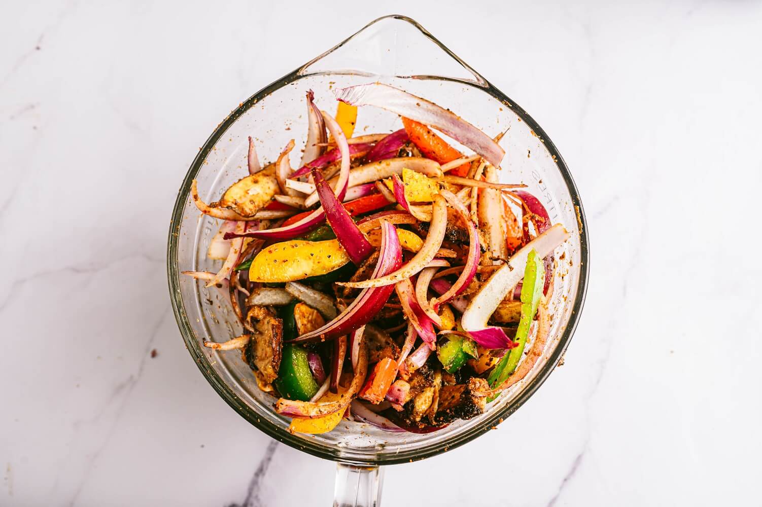 - Thinly slice the bell peppers and red onion. Remove the stems and slice the portobello mushrooms. Smash the garlic cloves. Place all prepared ingredients in a bowl and toss with 3 tablespoons of the olive oil, cumin, chili powder, garlic powder, smoked paprika, kosher salt and fresh ground pepper.