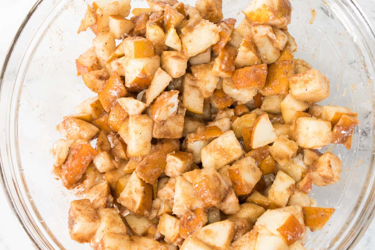 Step 1: Prep the oven and pears. Preheat your oven to 375ºF (190ºC). Lightly grease and 8X8 inch baking dish or 9-inch round pie dish. In a large bowl, combine the chopped pears.