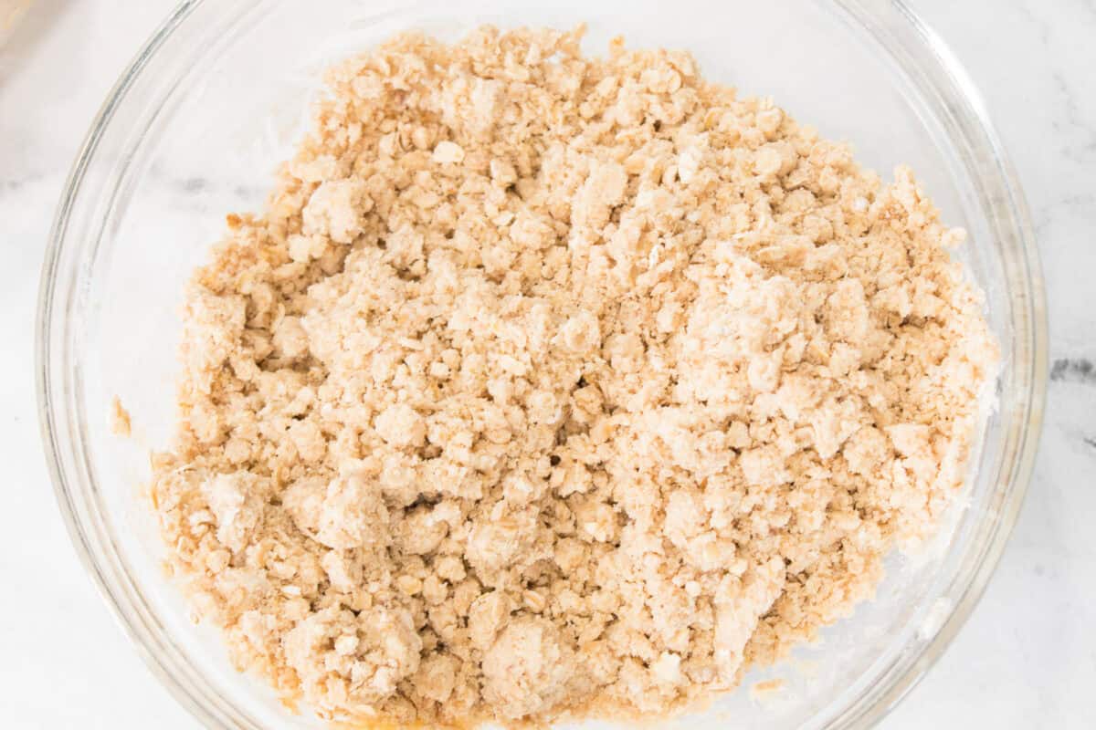 Step 3: Then, mix the crumble topping. In a separate medium bowl, combine the flour, rolled oats, brown sugar, cinnamon, and salt. Pour the melted butter over the dry ingredients. Mix with a fork until the mixture is fully incorporated and looks like coarse, thick crumbs.