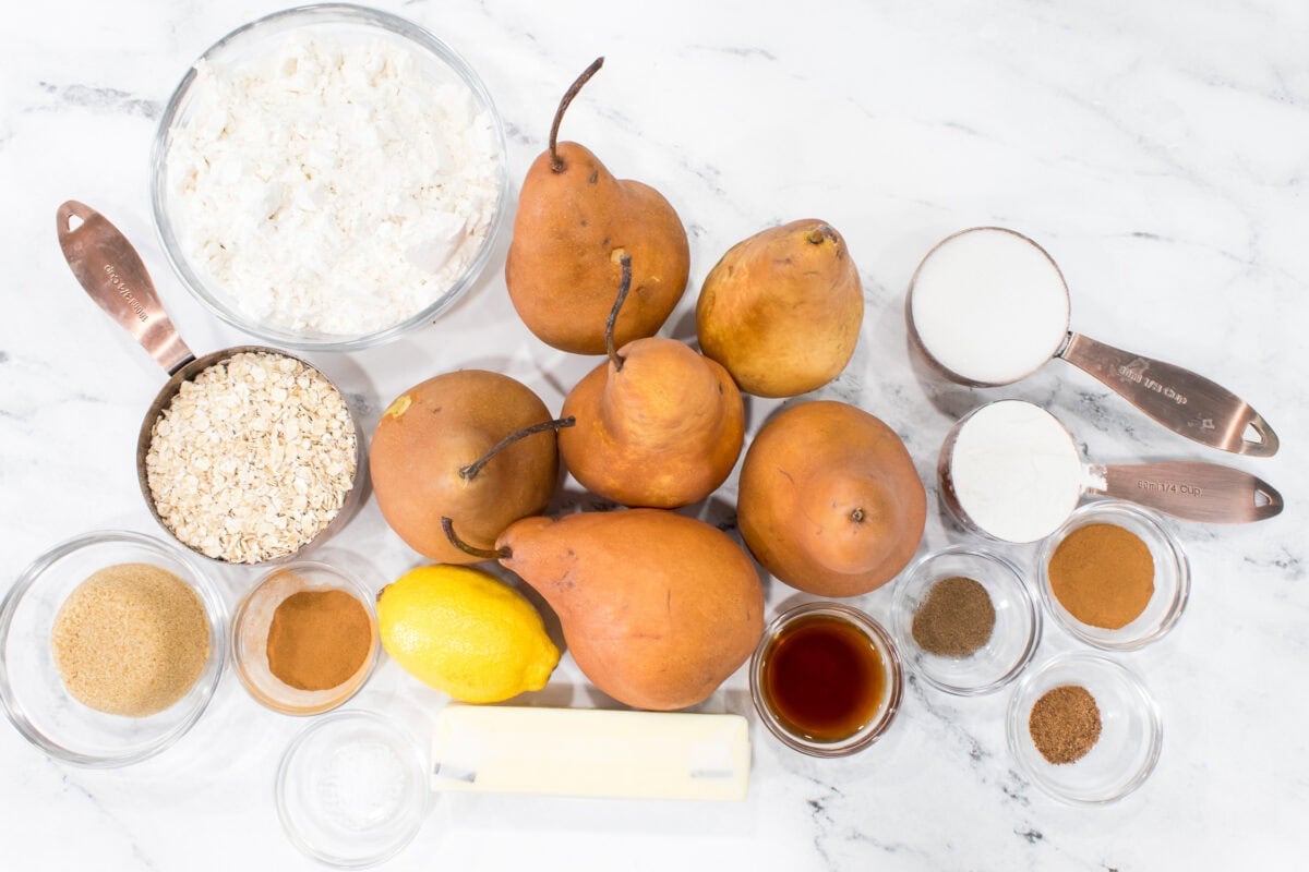 • Step 1: Prep the oven and pears. Preheat your oven to 375°F (190°C). Lightly grease an 8×8 inch baking dish or 9-inch round pie dish. In a large bowl, combine the chopped pears.