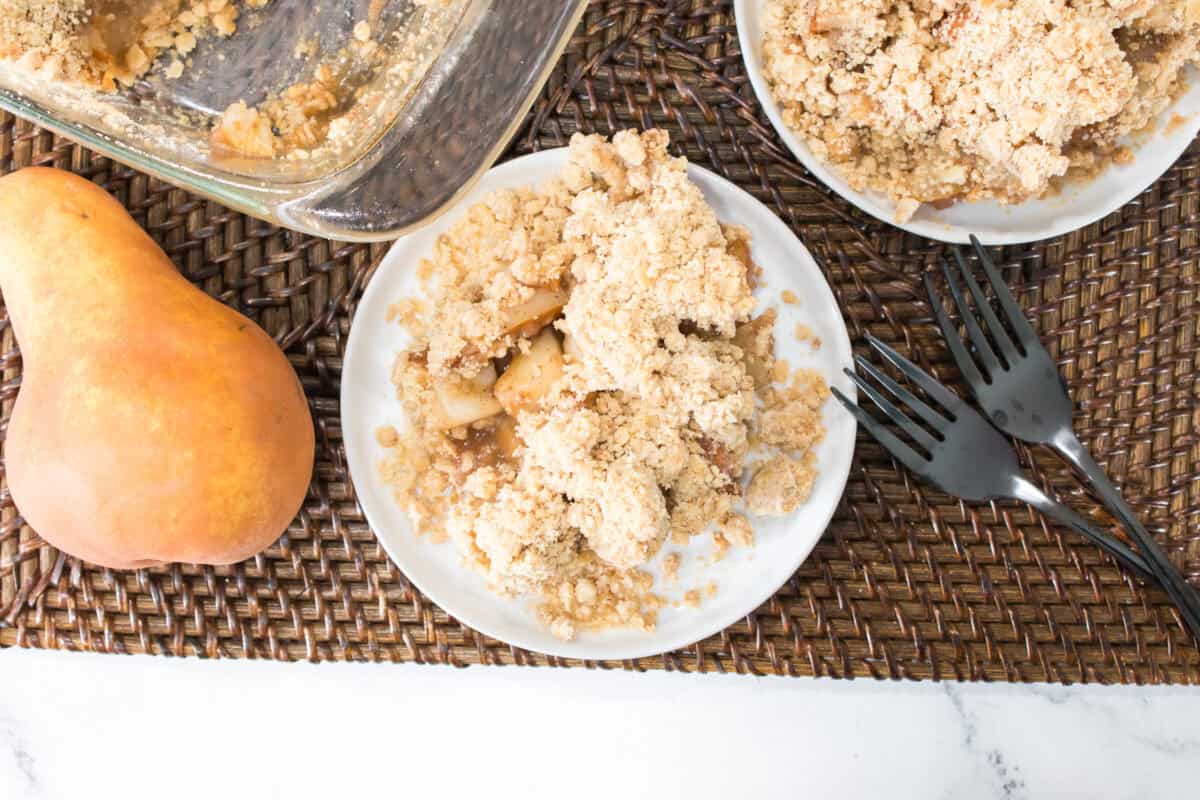 This Easy Pear Crumble is the perfect cozy dessert for any season, especially the holidays and winter months! Featuring tender Bosc pears perfectly spiced with cinnamon and nutmeg and topped with a buttery, crispy oat crumble, it's a guaranteed crowd-pleaser.