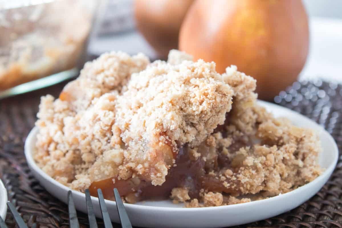 • Evenly sprinkle the entire crumble topping over the pear filling. Bake for 45 to 55 minutes, or until the topping is golden brown and the pear filling is bubbling around the edges. Let cool for at least 15 minutes before serving—this allows the delicious sauce to thicken!