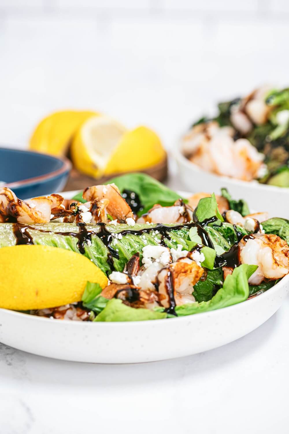 Grilled Caesar Salad with Shrimp + Balsamic Glaze