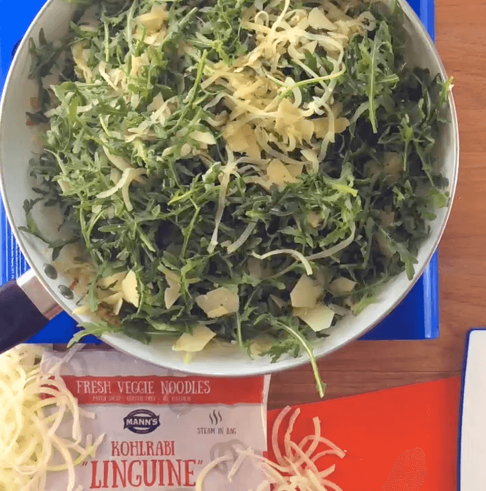 - Add the Kohlrabi Linguine and arugula to the garlic butter. Top with shaved parmesan cheese.