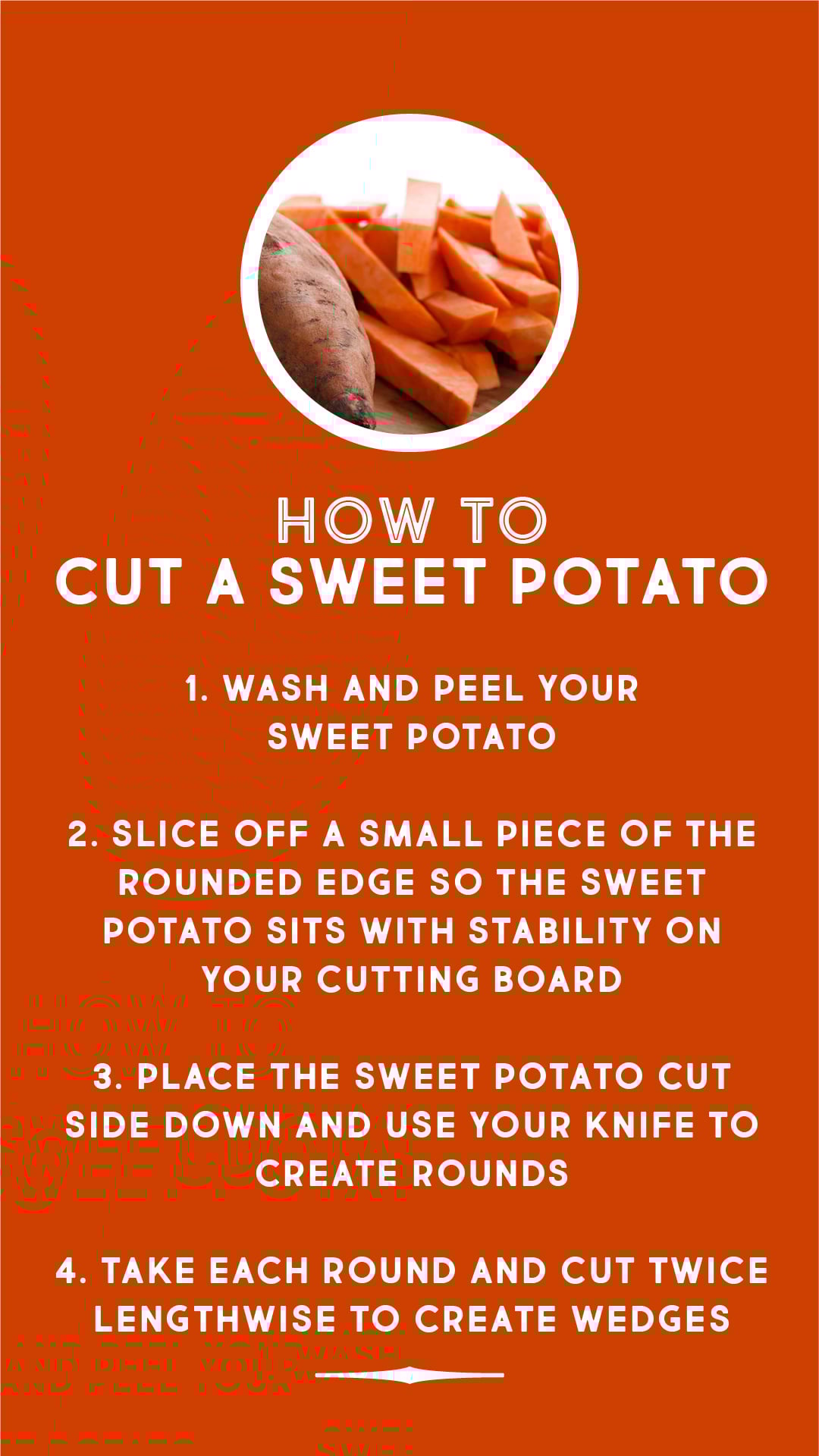 To cut sweet potatoes wedges, start by rinsing and lightly scrubbing them to remove dirt before peeling the potatoes. Slice off a small portion of the potato to create a flat surface so your potato sits steadily on your cutting board. Next, cut lengthwise through the potato to create rounds. Cut each round twice lengthwise to make wedges.
