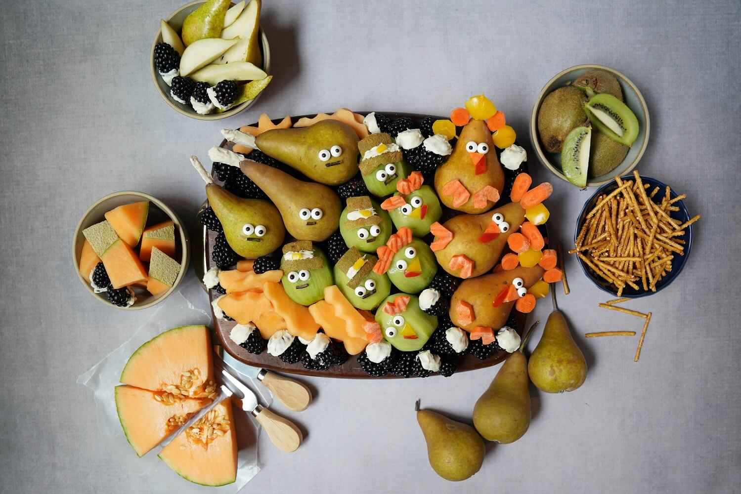 Our Thanksgiving food art display will delight every member of your family from the kids to the grandparents. And when they see these delicious pears, kiwi, and carrots, theyโll be delighted to dig in, too!