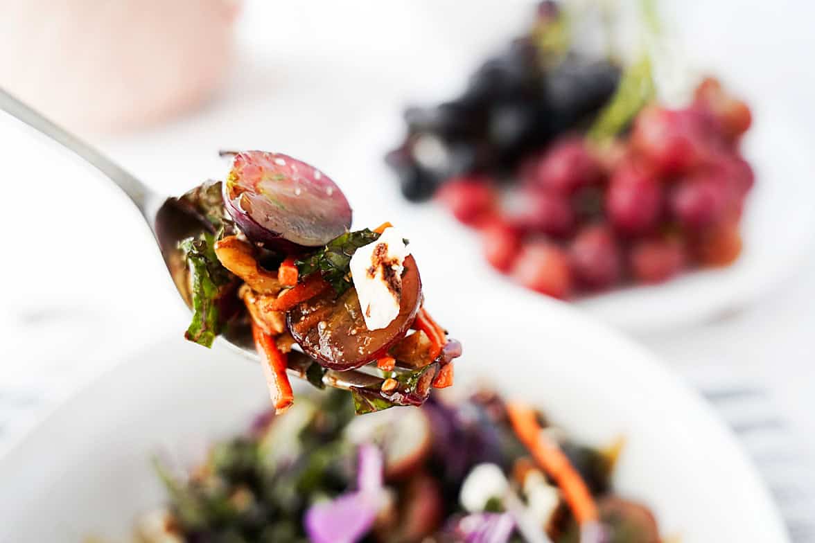 - Step 2: Combine the Ingredients: Add the halved Black and Red Table Grapes, thinly sliced red onion, chopped walnuts, and shredded carrots to the bowl with the greens.