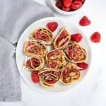 Evenly distribute the raspberries on top of the peanut butter, applying light pressure with your hands so the berries “stick” to the tortilla.